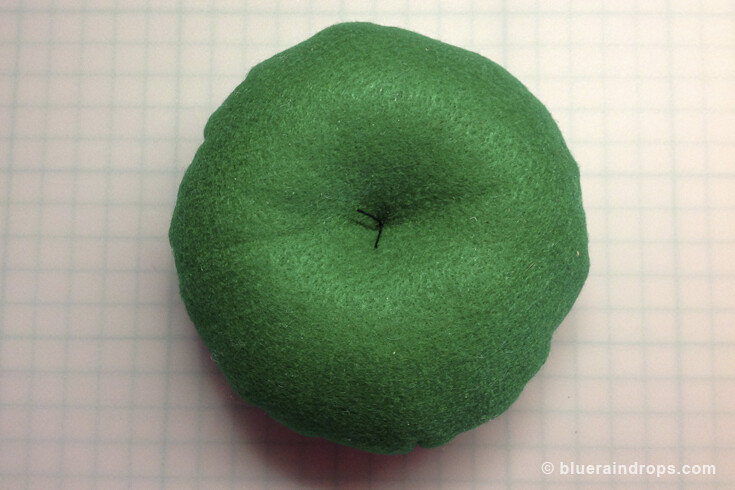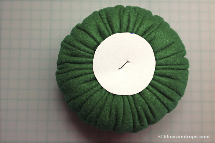 Grab the thread tails that come out of the center of the pincushion and pull tight to dimple the center of the cushion. Tie off and secure with a couple of knots.