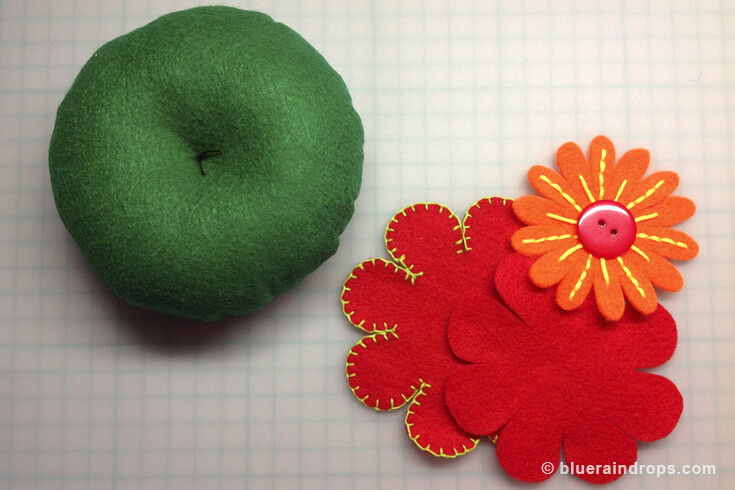 - Make your flower and glue or sew the petals and the button. Using your hot glue gun, glue it on the pincushion.